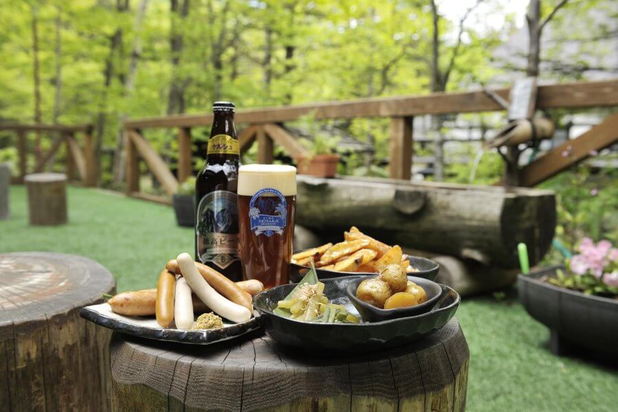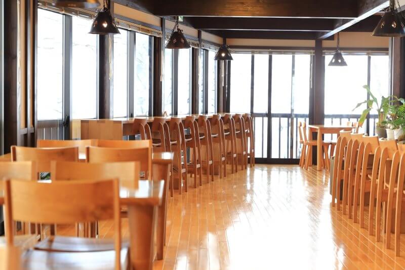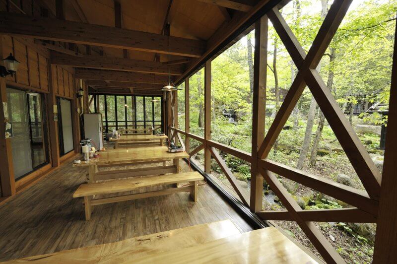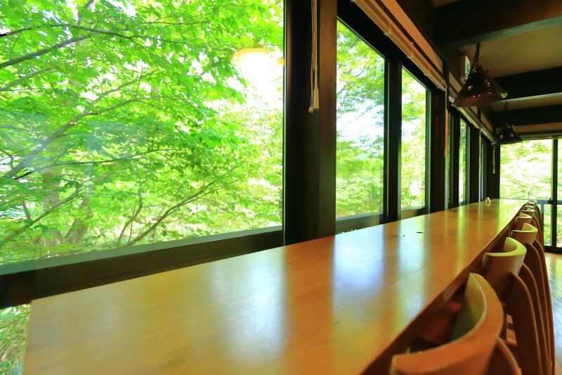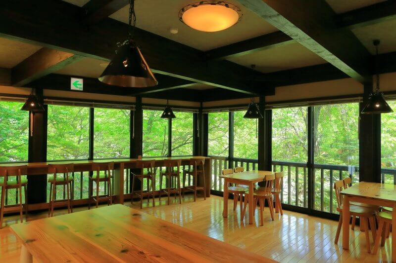 合掌造り湯上り処を更に進んだ先にある自然豊かな森のレストラン。床暖房完備の広々した座敷と森に面したテーブル席・カウンター席があります。素泊まりや1泊朝食付きでのご宿泊の方は、こちらでのご夕食がおすすめです。