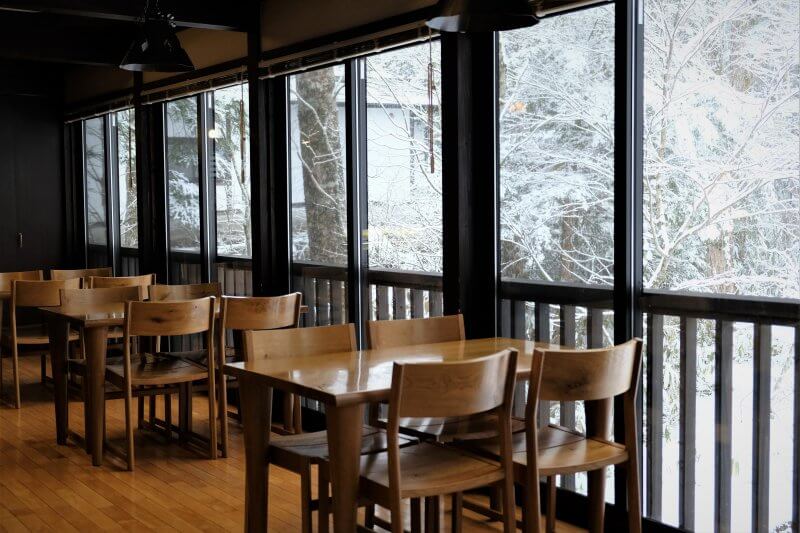 一面大きな窓で四季折々の平湯景色を眺めながら、コーヒーで一服。