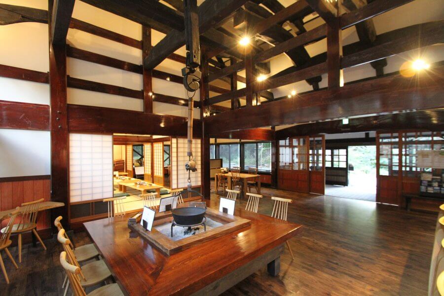 名瀑平湯大滝の入り口、平湯温泉スキー場に隣接する吹き抜け合掌造りのお食事処。