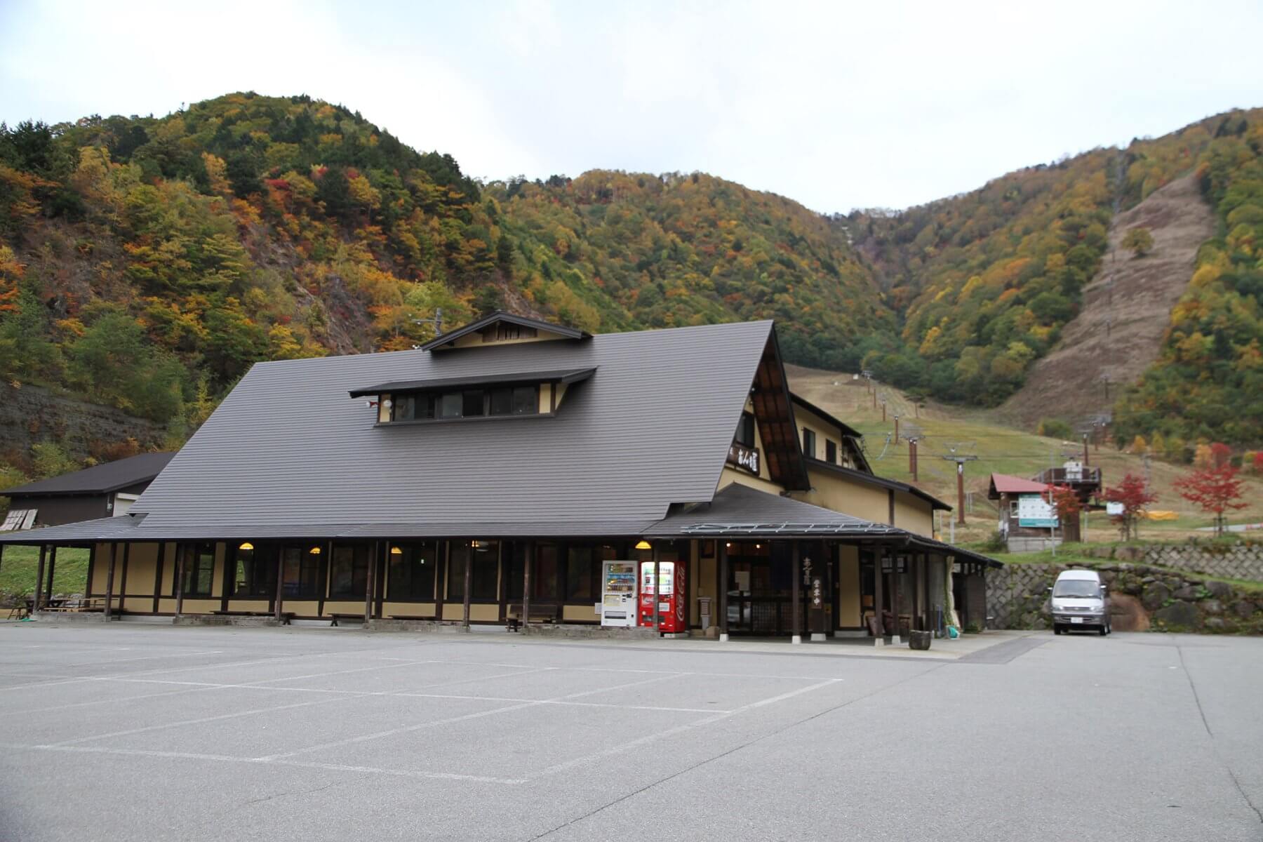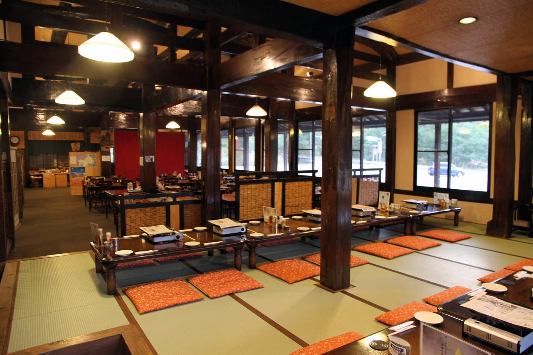 名瀑平湯大滝の入り口、平湯温泉スキー場に隣接する吹き抜け合掌造りのお食事処。