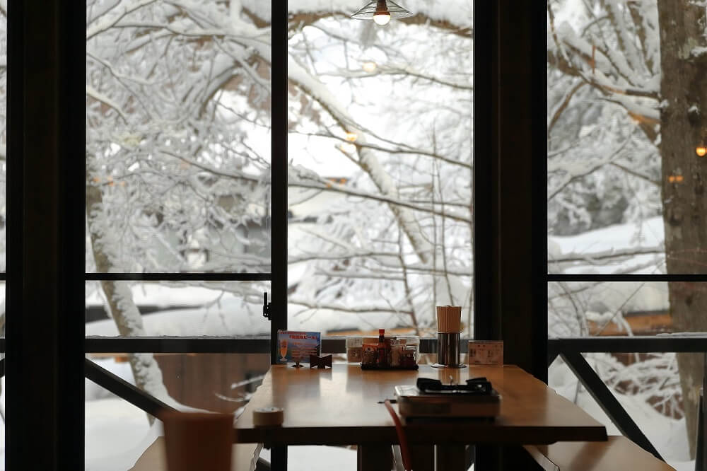 一面大きな窓で四季折々の平湯景色を眺めながら、コーヒーで一服。